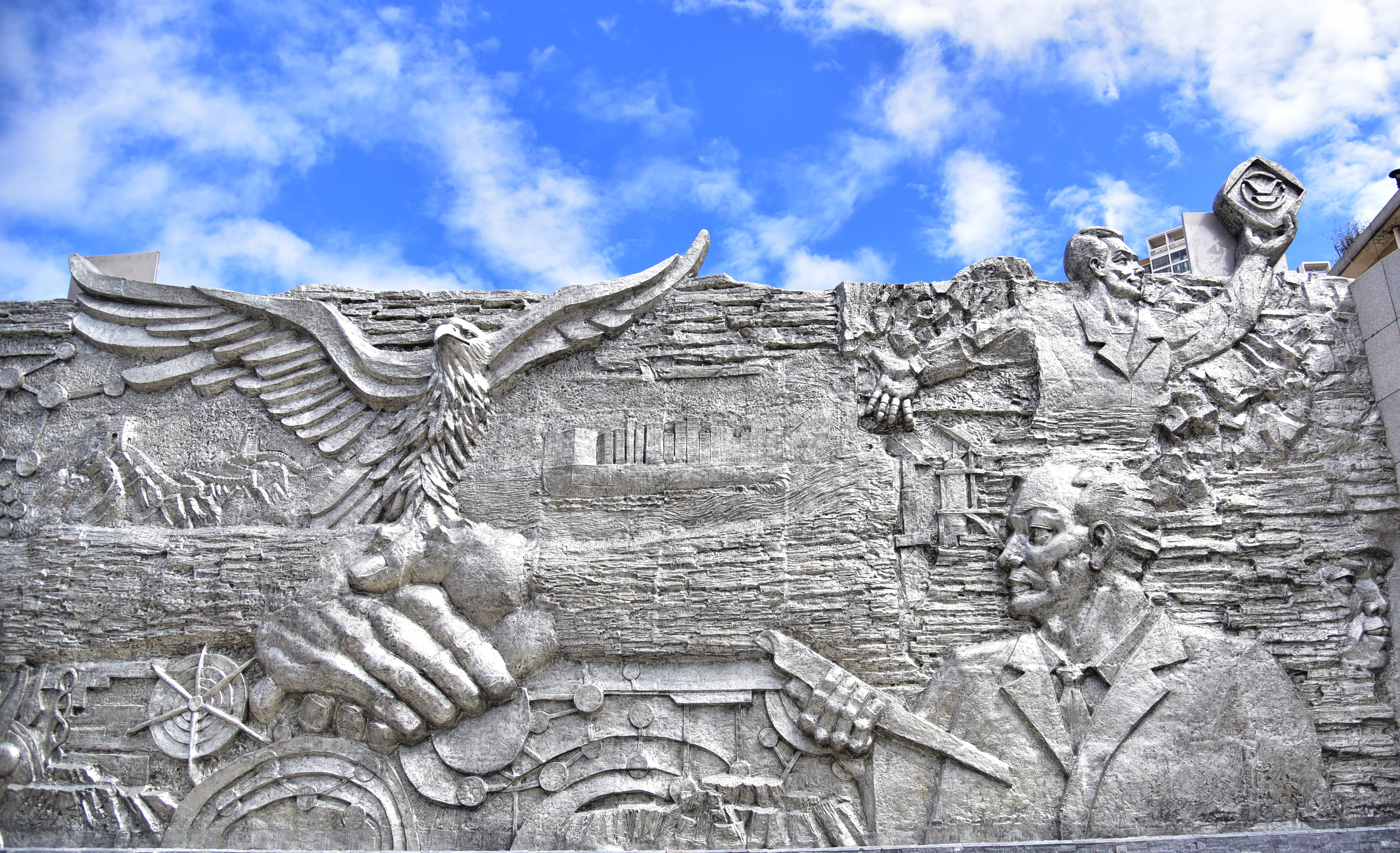 目光如炬的新時代云錫產業工人、盡顯家鄉民族文化的哈尼梯田、代表美譽濺滿中國乃至世界的錫水、艱苦創業的古時錫業人穿越時空走進新云錫、錫產品在高鐵和航天產品等行業的廣泛運用、助力云錫快速發展的大型工業設備、寓意云錫技術進步的齒輪、寓意云錫全球化發展的地球、寓意引領全球錫業而展翅高飛的雄鷹、高舉“YT”品牌以更寬視野注目著未來的云錫人……在以英文字母“T”為中軸的右側主題浮雕墻上,一組組極具真實感的畫面仿佛在描繪著 “云騰萬里”的豪邁。