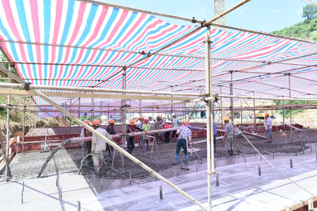 大體積鋼筋混凝土底板澆灌是攔水壩筑壩前的最后一道奠基工序,澆灌過程中一旦出現質量偏差,前期施工準備工作都將付之一炬,勢必導致整個尾礦庫竣工時間延期。這項看似簡單、實則不易的工作牽動著每一位參建者的神智。錫業股份副總經理浦承堯、童祥,指揮長劉長武、副指揮長尹紅兵等領導多次親臨現場指導工作,加強專業技術人員與現場施工隊伍的對接,抽調施工機械、出臺應急預案等多項舉措為順利施工提供有力保障。云南建制、監理單位從時間進度、工程結構、質量信譽、成本預算、安全目標、施工效率等流程化策劃準備。7月17日中午13點16分,蓄勢已久的混泥土開始從灌車連續不斷輸送到現場區域,按照混凝土表里溫度相差不能多于20攝氏度的技術規范,項目負責人、技術員每隔兩小時就必須往返于澆灌場地的每一個探頭之間,對混凝土表里三個厚度的溫度進行實時測控,根據溫差采取塑料薄膜保溫或循環水降溫的方式進行布控調節。